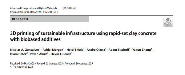 這項研究以題為“3D printing of sustainableinfrastructure using rapid-set clay concrete with biobased additives”的論文發(fā)表在《先進復(fù)合材料和混合材料》雜志上,由俄勒岡州立大學(xué)的德文·羅奇(Devin Roach)、尼古拉斯·貢薩爾維斯(Nicolas Gonsalves)等人聯(lián)合撰寫。項目得到了美國農(nóng)業(yè)部、俄勒岡州立大學(xué)全球大麻創(chuàng)新中心和工程學(xué)院的支持。