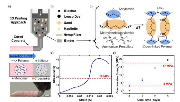 △利用正面聚合的3D打印聚合物基混凝土方法。a)擠出成型時正面聚合聚合物基混凝土的示意圖(上、中)和圖像(下),下圖顯示了本研究中使用的混合物,比例尺為10 mm。b)構(gòu)成快速凝固聚合物基混凝土的組分。c)用于正面聚合的聚合物粘合劑的化學(xué)配方。d)固化生物混凝土的抗壓強度測試結(jié)果表明,抗壓強度遠(yuǎn)高于住宅基礎(chǔ)設(shè)施所需的17 MPa。e)固化時間測試表明,生物混凝土在聚合后立即達到瞬時強度,聚合時強度為3 MPa,3天后超過17 MPa。結(jié)果與未固化混凝土(紅點)的強度(接近0 MPa)進行比較。