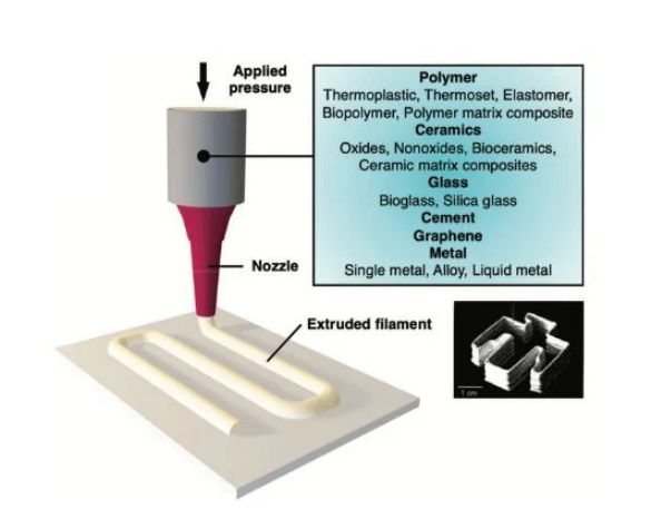 此外,由于該技術(shù)可在室溫下進(jìn)行擠出,因此便于加工熱敏性化合物。它也克服了其他依賴高溫的擠出方法的局限性。然而,打印速度仍然相對較慢,且在較高速度下層間結(jié)合質(zhì)量可能會(huì)受到影響。因此,如何在效率和結(jié)構(gòu)性能之間找到平衡點(diǎn)是一項(xiàng)挑戰(zhàn)。
